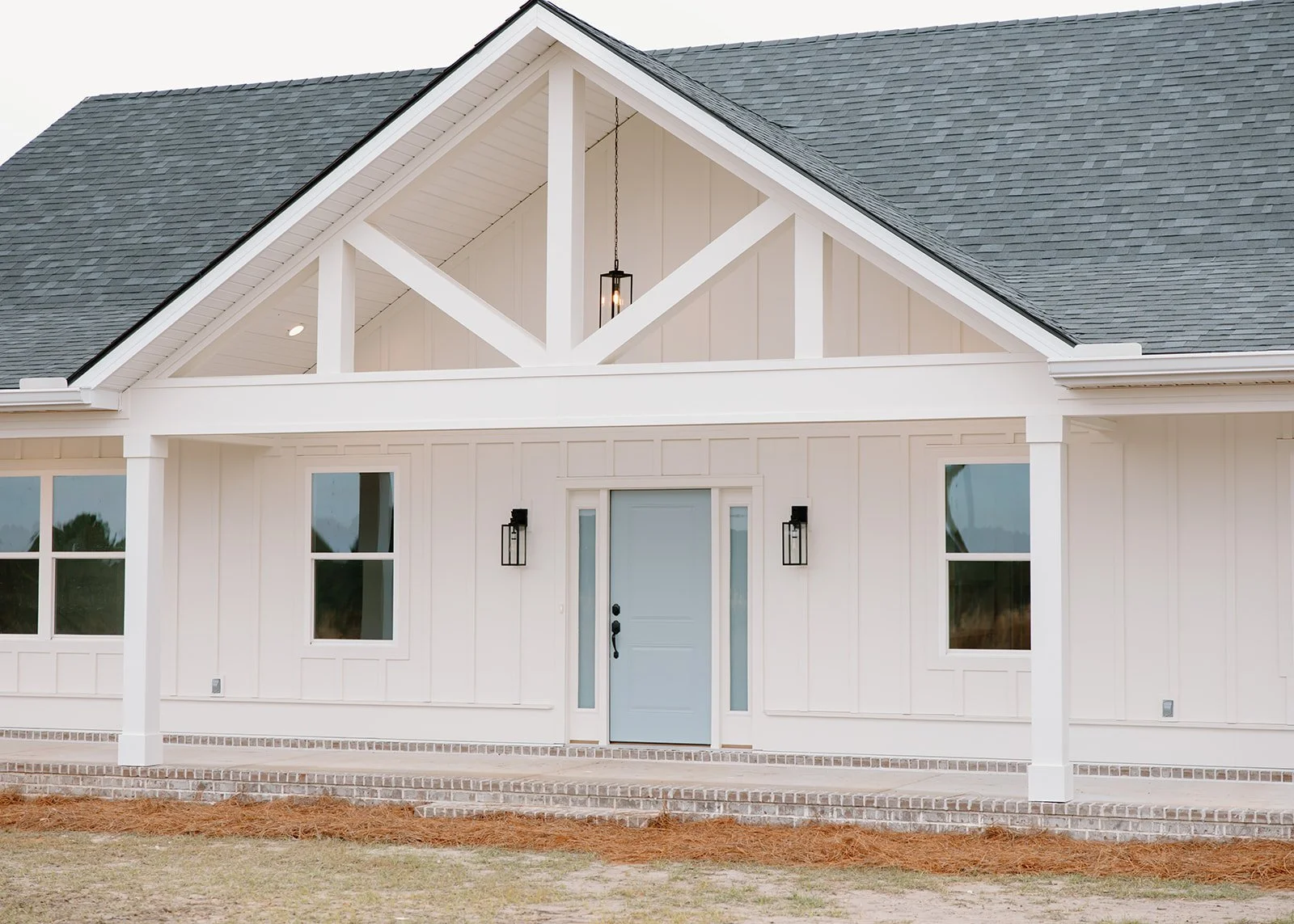 This custom home in Claxton, Georgia showcases classic Southern charm paired with thoughtful craftsmanship. The inviting white exterior, defined by clean lines and a welcoming front porch, is complemented by a soft blue front door—a signature color thoughtfully carried throughout the home.